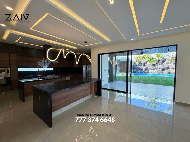 En planta baja tiene una gran sala y comedor con vista al jardín. Todo con una hermosa decoración con luz indirecta y doble altura en la sala. Una impresionante cocina con dos islas. Una sirve como desayunador y en la otra se encuentra la parrilla, todo con cubiertas de cuarzo. También alacena, cuarto de lavado y cuarto de servicio con baño completo