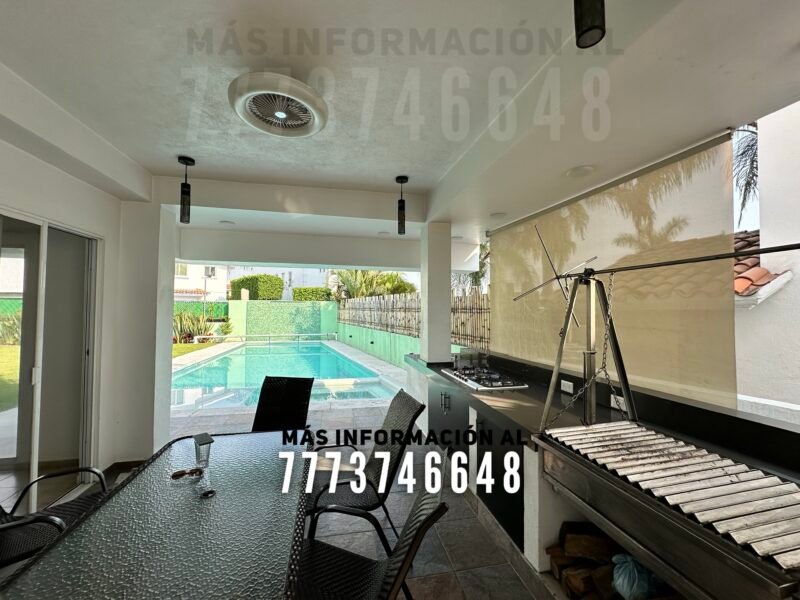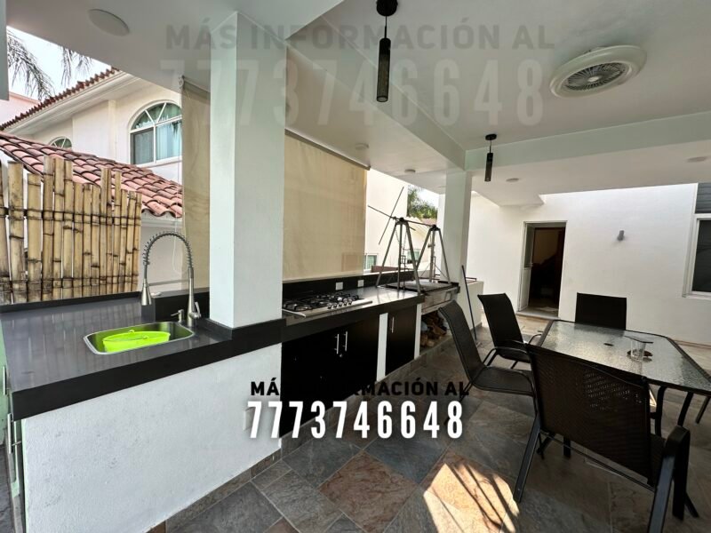 En exterior una terraza con buena orientación, ya que, tiene sombra prácticamente todo el día. Después tenemos el área de asador. Aquí se encuentra una gran barra con parrilla, asador y tarja. Después tenemos un cuarto de lavado y un cuarto de servicio con baño completo Tiene una gran alberca, la cual tiene calefacción solar y caldera. También cuenta con jacuzzi y una bonita caída de agua hacia ella. Y claro, le queda un jardín de excelente tamaño