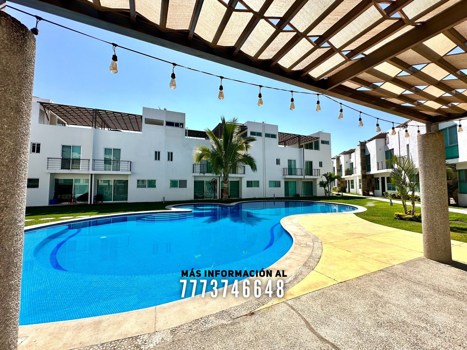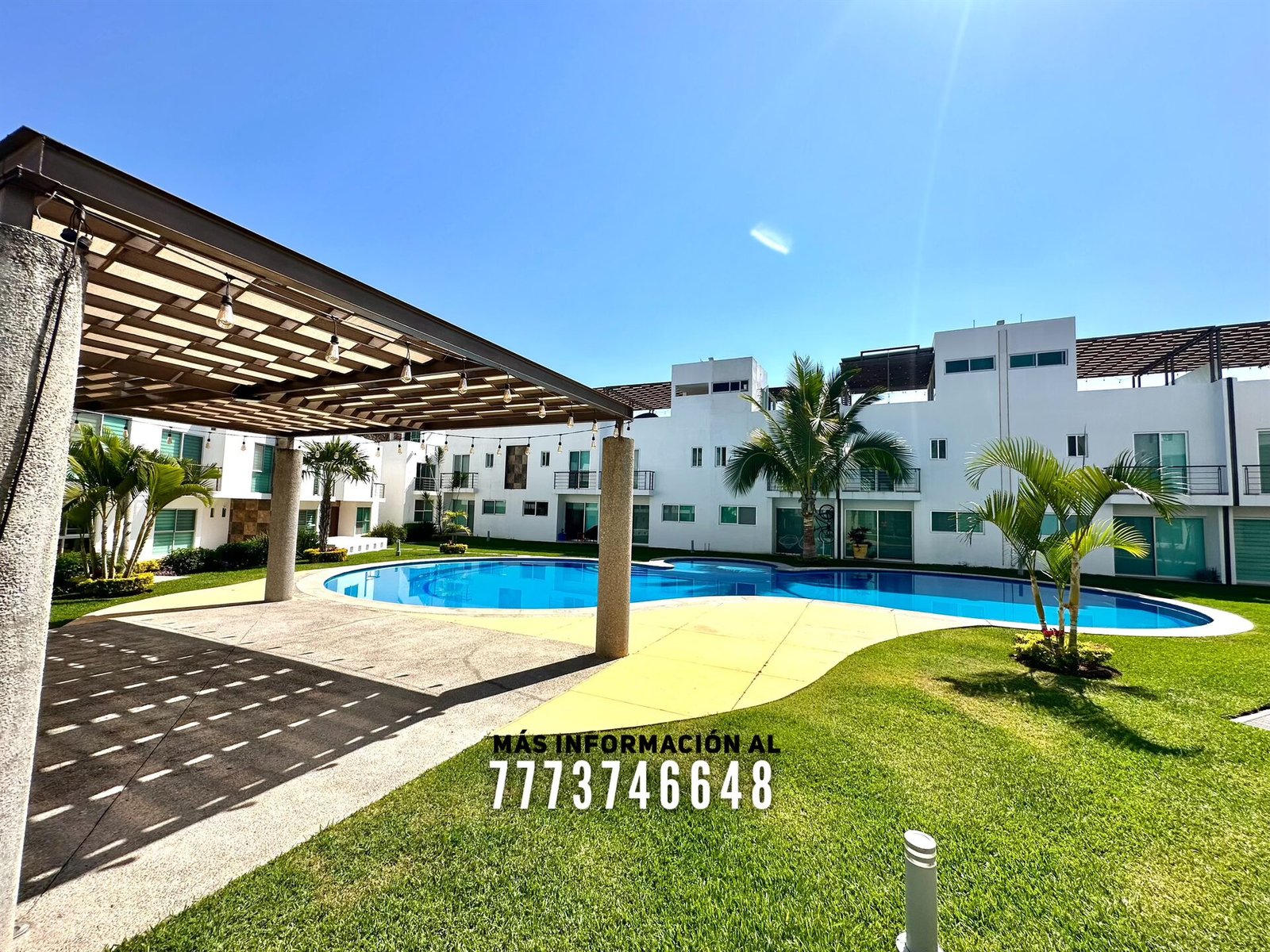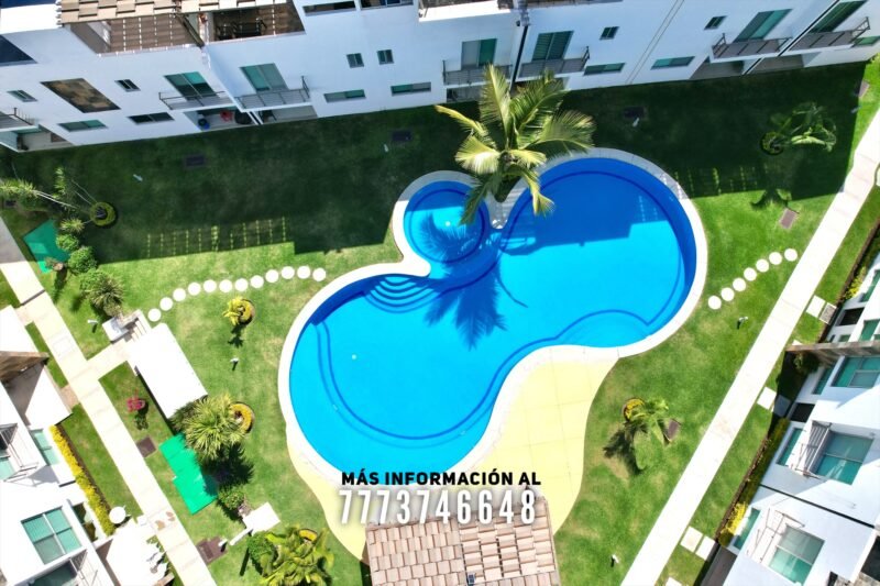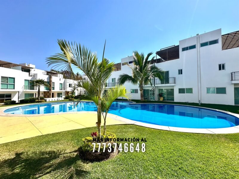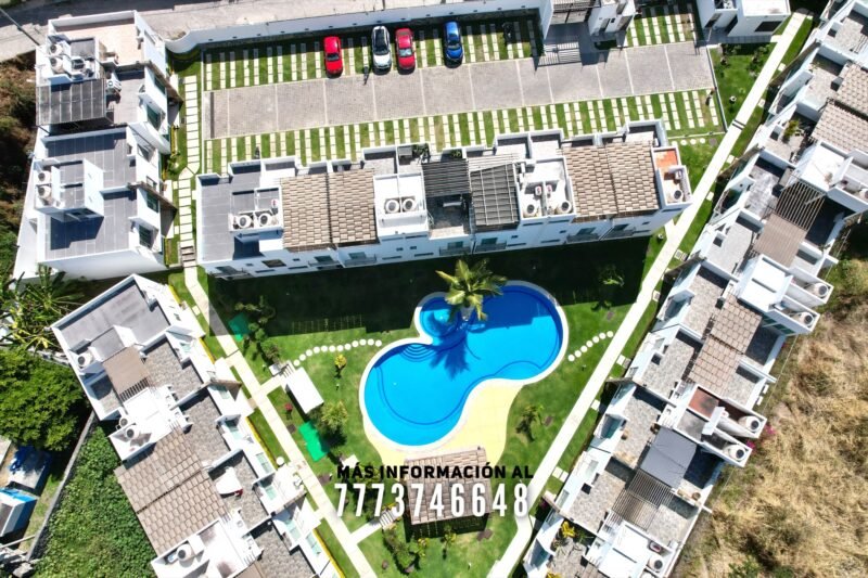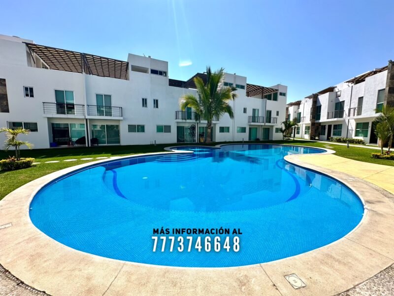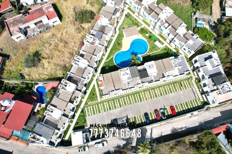 En áreas comunes tiene grandes áreas verdes con bonita decoración, una alberca de asombroso tamaño, zona de chapoteadero, palapa y regadera tipo playera. Cada casa cuenta con estacionamiento a unos metros.