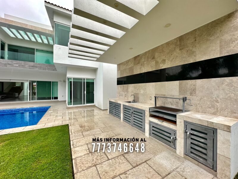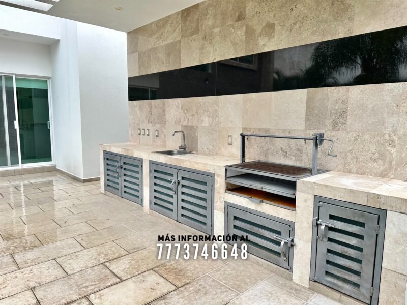 En exterior una amplia terraza con buena orientación, ya que tiene sombra prácticamente todo el día. Más adelante tenemos una barra con asador y tarja, completamente techado. Atrás de esta área se encuentra el cuarto de máquinas y un baño completo que le da servicio a todo el jardín.