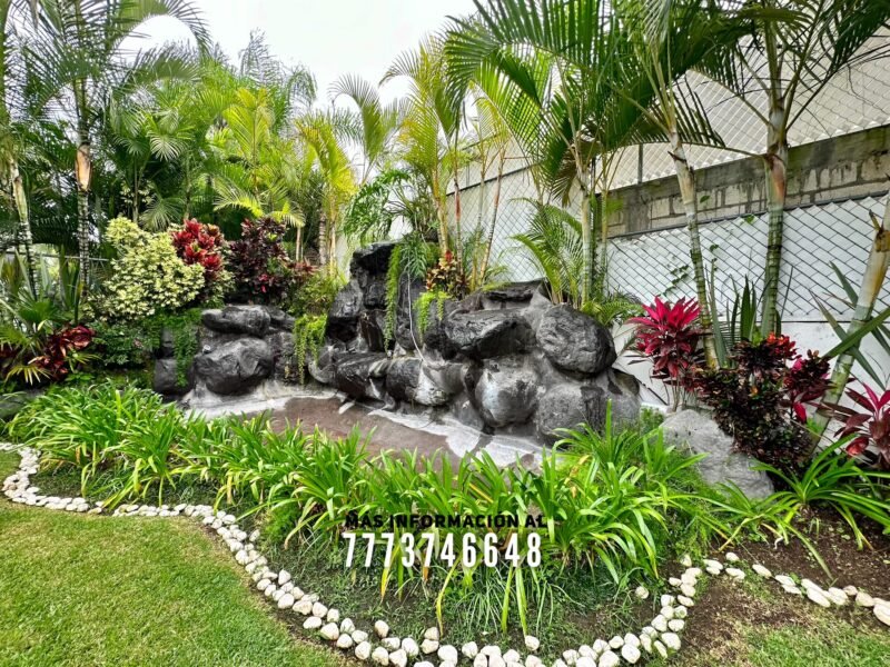 Hablando de jardín, le queda muy buen espacio y todo con bonita decoración. También tiene una bonita cascada de piedra natural No podía faltar una alberca de buenas dimensiones, ya cuenta con caldera, chapoteadero y jacuzzi.