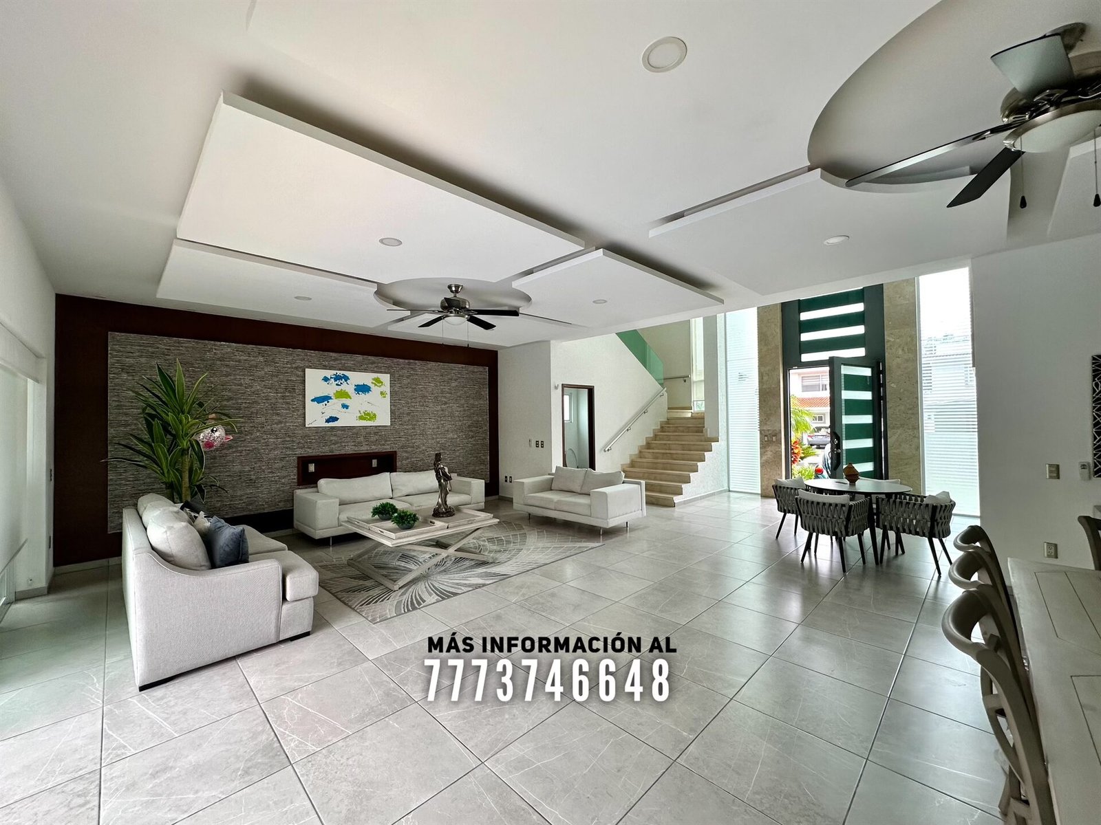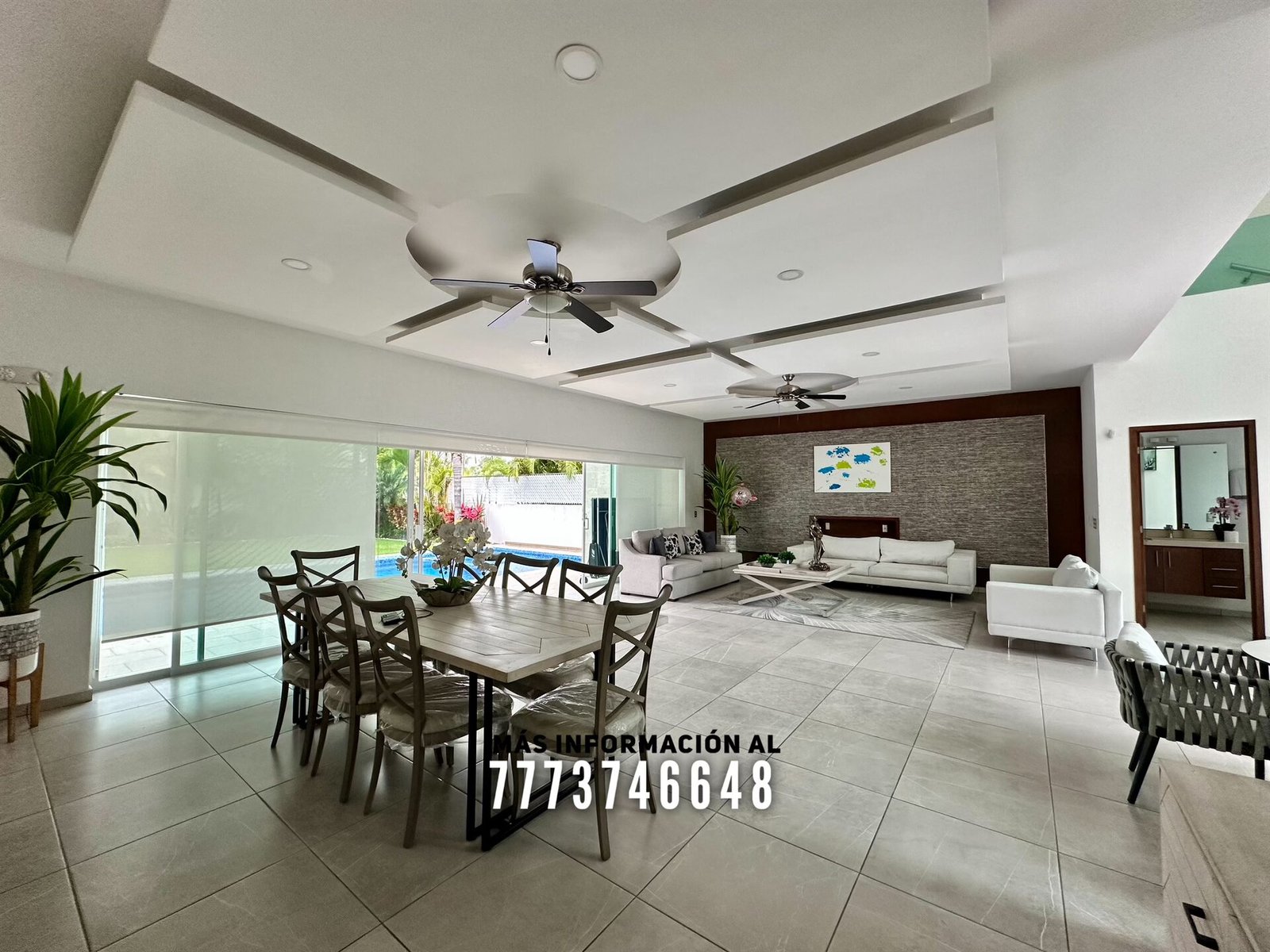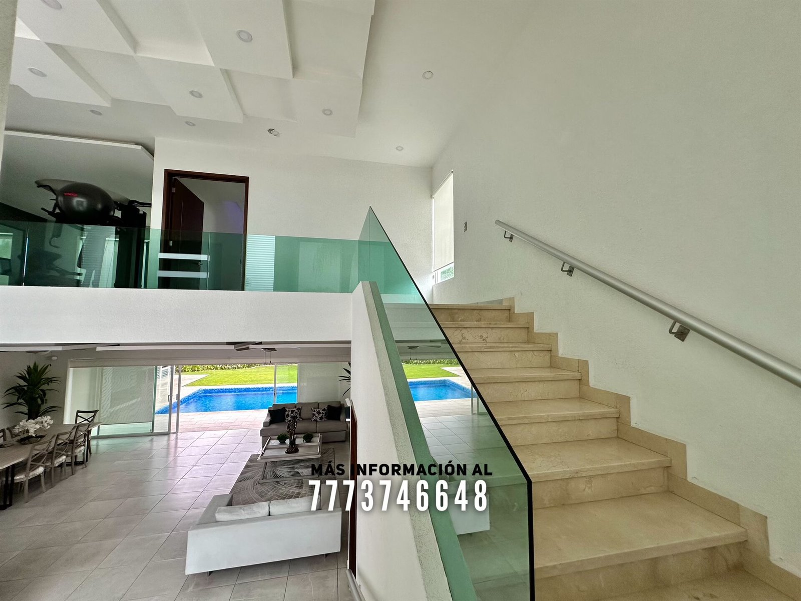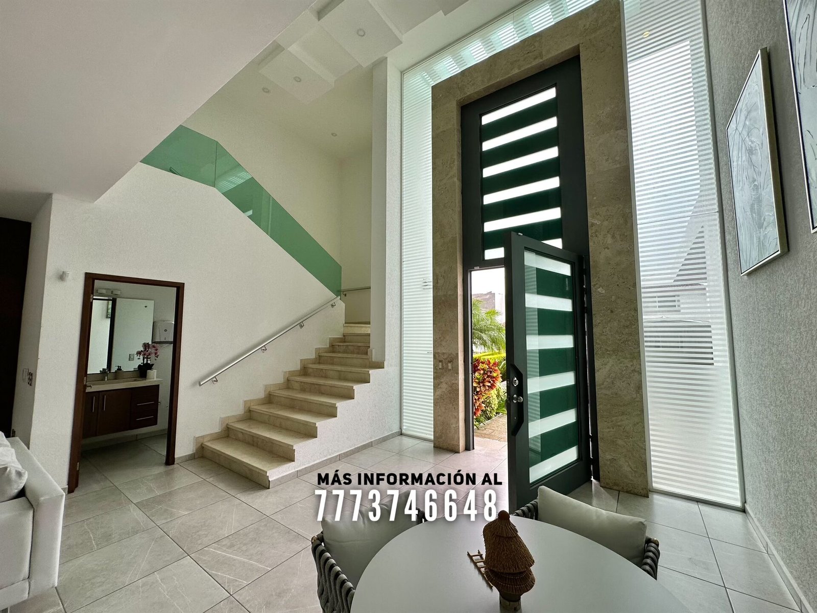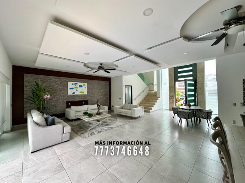 Al entrar tenemos un gran vestíbulo a doble altura, lo primero que ves es una bonita vista hacia el jardín y alberca. En planta baja cuenta con una gran área de sala y comedor con hermosa decoración con luz indirecta y vista al jardín. A un costado se encuentra un medio baño para visitas