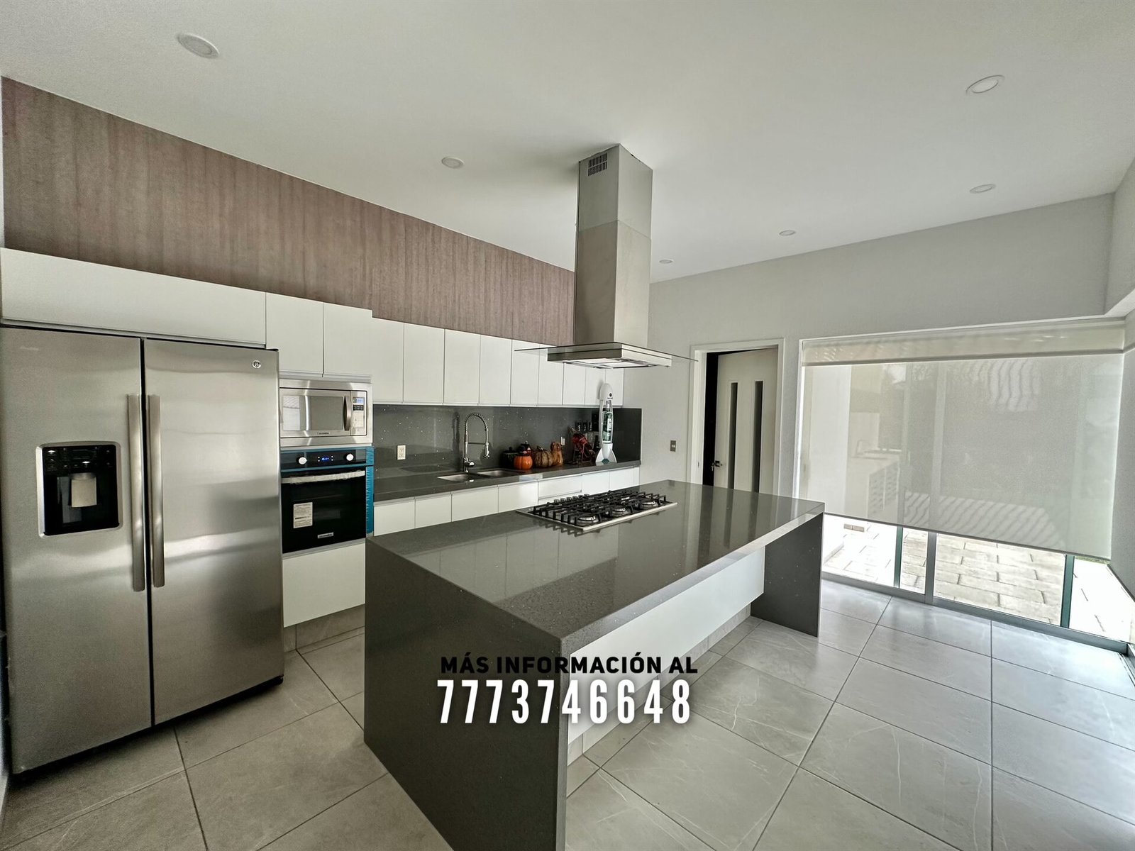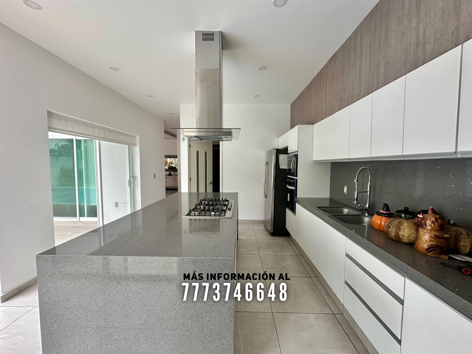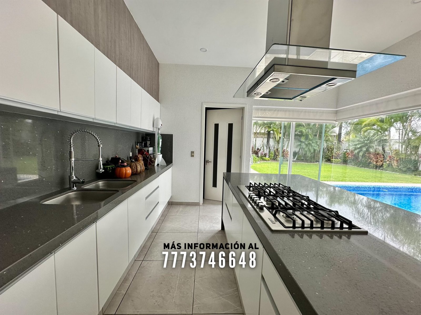 Después tenemos una cocina de gran tamaño con isla y todo con cubiertas de cuarzo. Tiene acceso directo al jardín, también cuenta con cuarto de alacena, cuarto de lavado y cuarto de servicio con baño completo