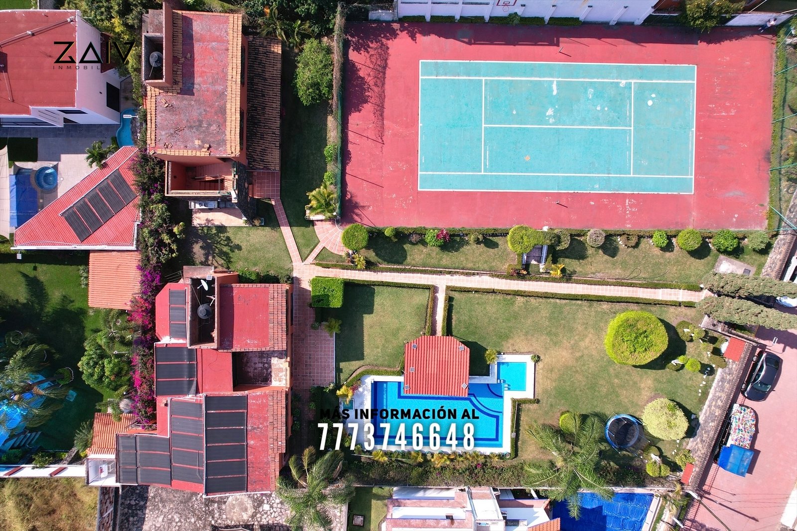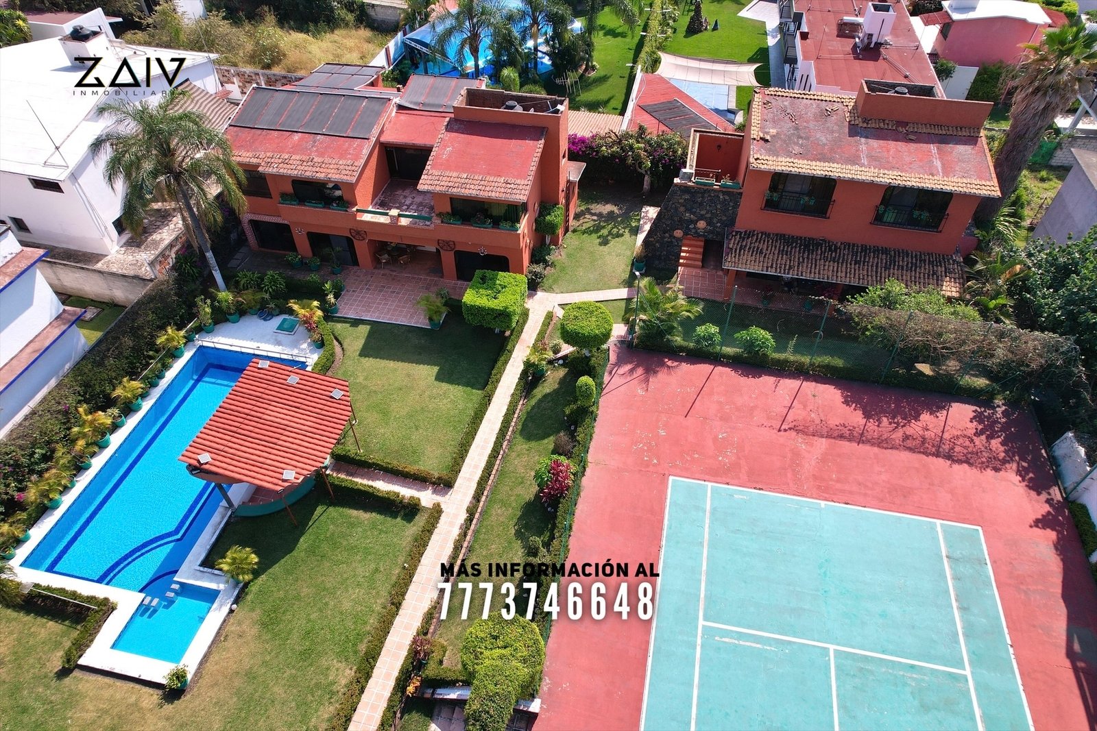 En exterior tiene dos bodegas de gran tamaño, área de asador y cuarto de servicio con baño completo. También la gran cancha de tenis con más de 500 m² de superficie. Después una gran alberca con calefacción solar, área de chapoteadero y aquabar techado. Le queda un excelente tamaño en jardín, todo con muy bonita decoración.