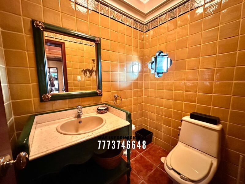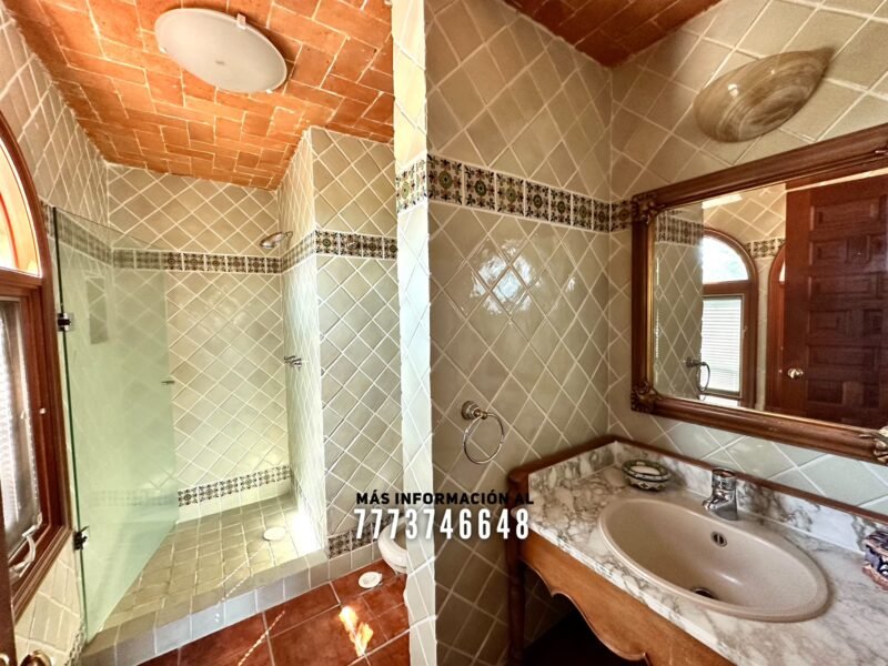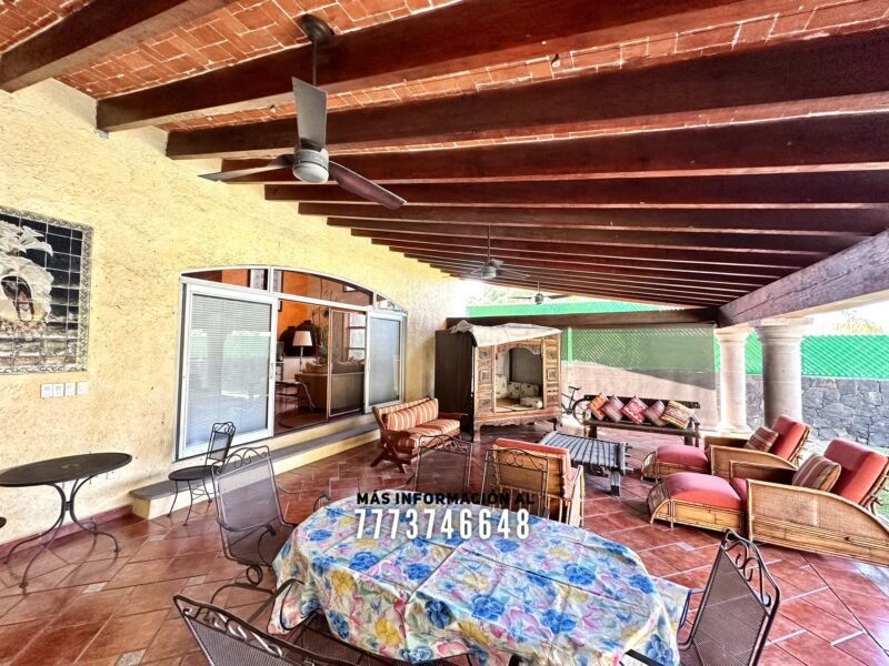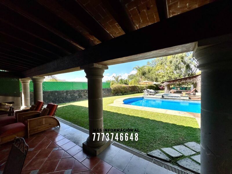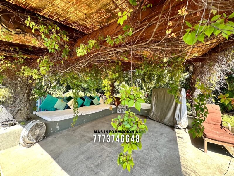 En exterior se encuentra la terraza, la cual mide más de 15 metros de largo. Después la gran alberca con caldera, área de chapoteadero y un acueducto con caída de agua hacia ella. A un costado el área para camastros Después una palapa con una gran barra, en ella se encuentra una parrilla y tarja. También tiene espacio para un comedor o sala de exterior. Atrás se encuentran dos medios baños y dos regaderas.