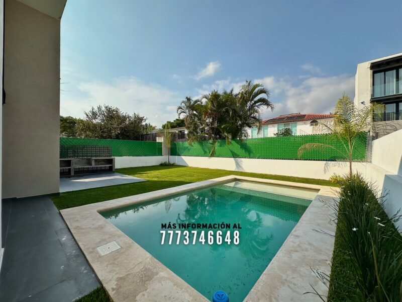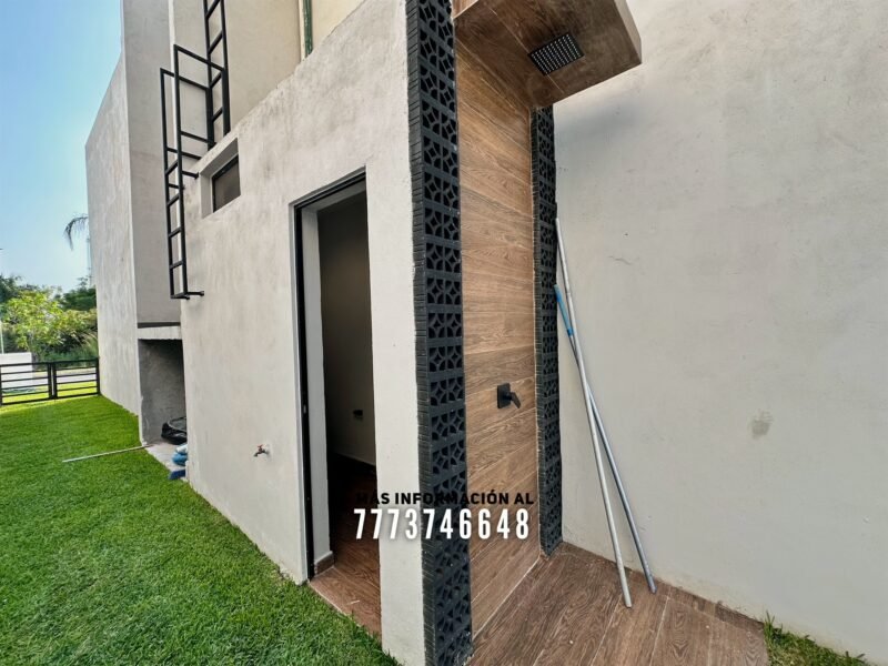 En exterior una terraza con barra y asador. Tiene medio baño y regadera tipo playera en jardín. Claro que no podía faltar la alberca y buen tamaño en jardín, el cual tiene una bonita decoración