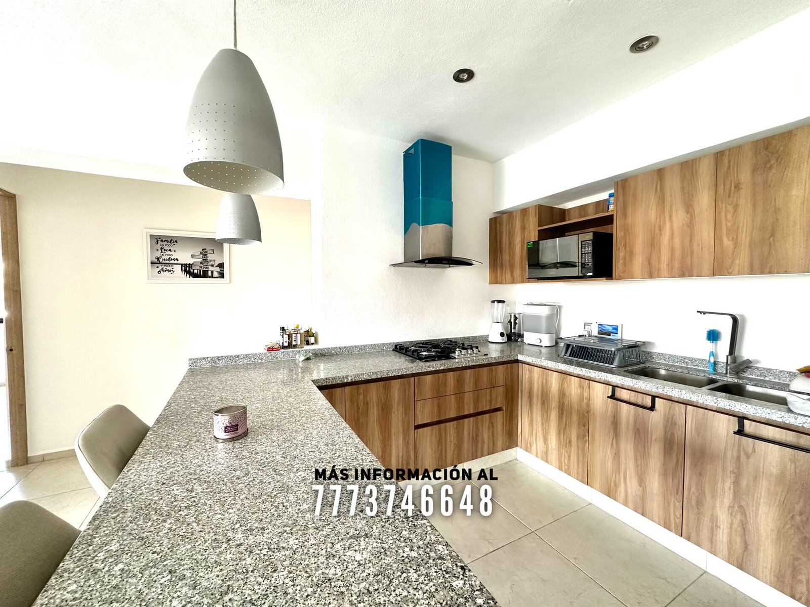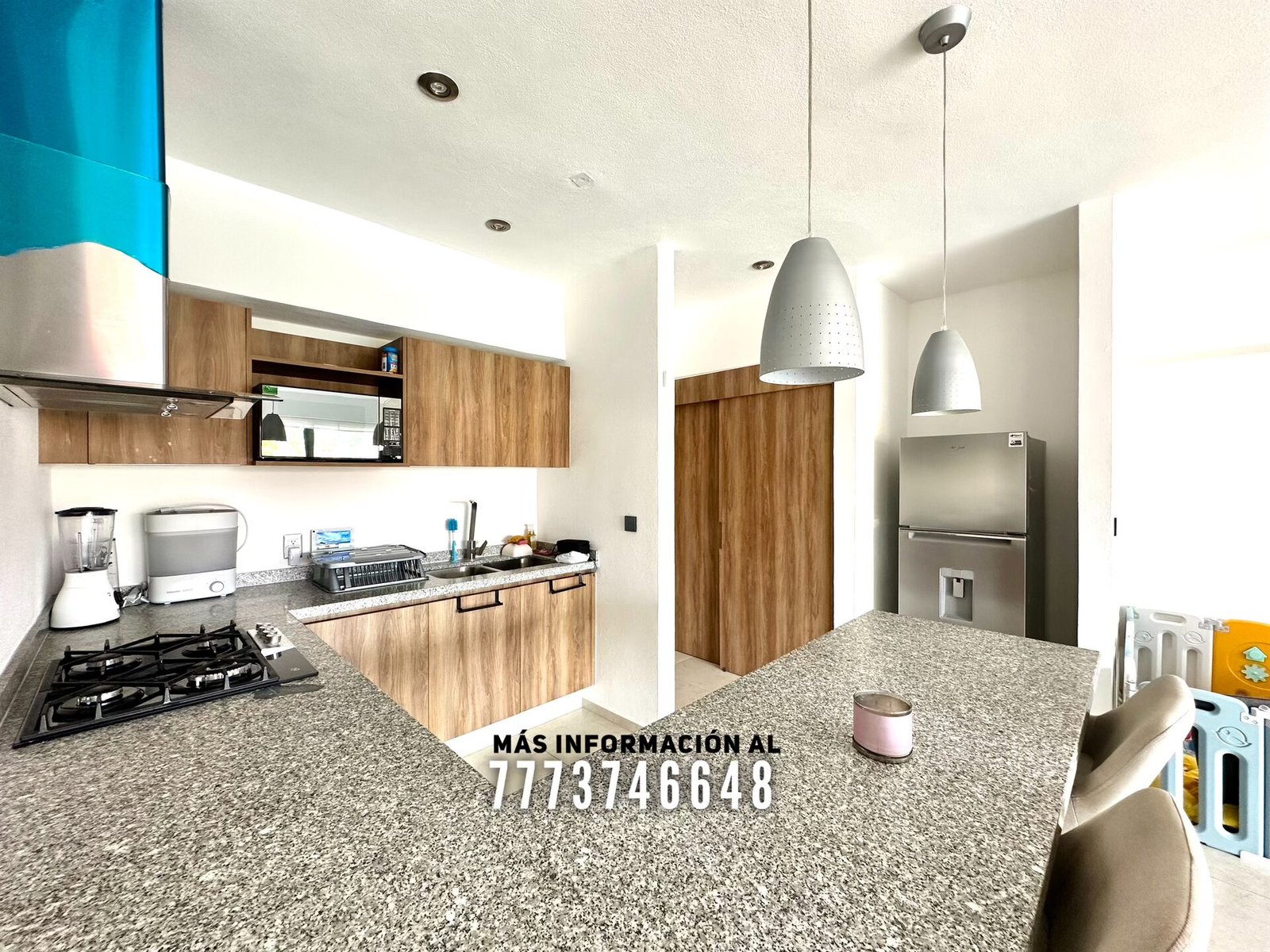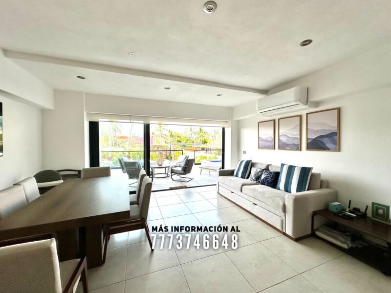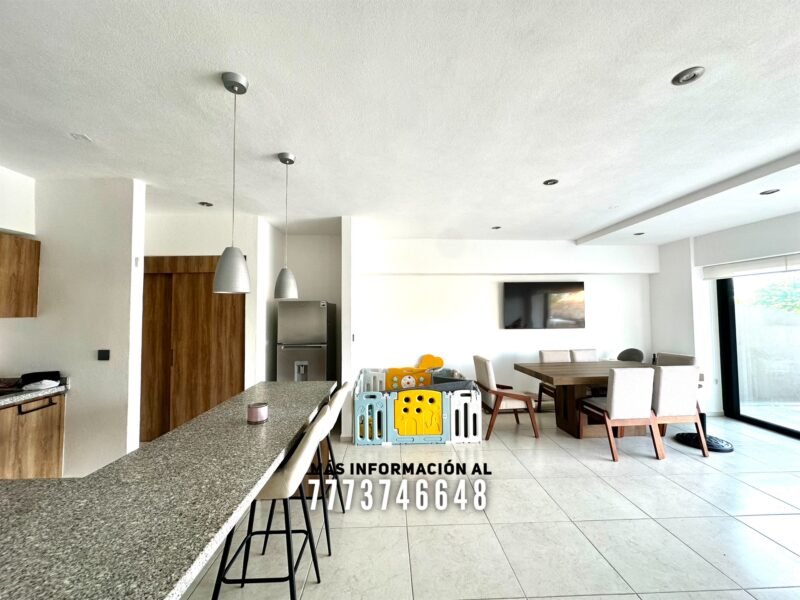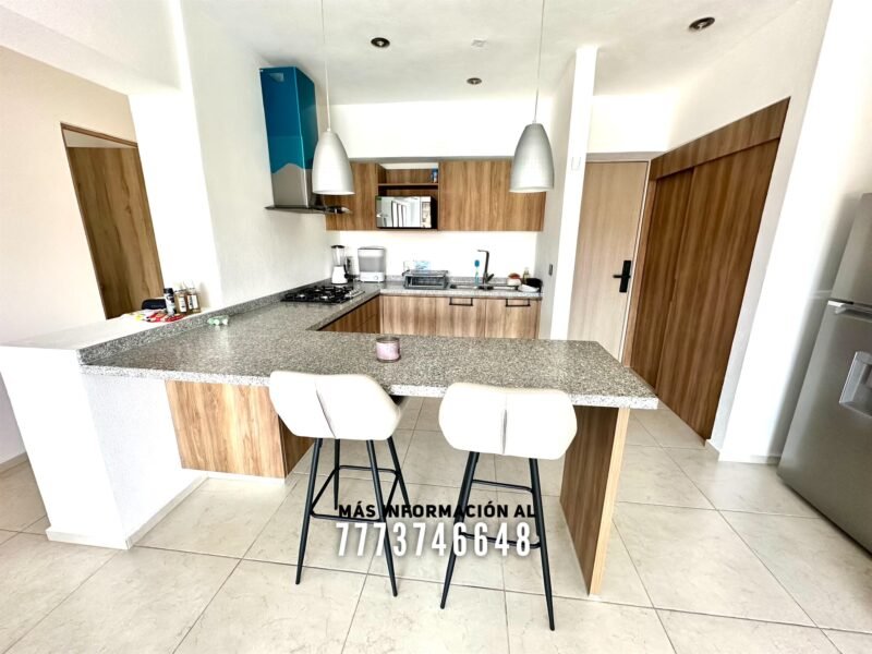Cuenta con una bonita cocina con excelentes dimensiones, bonita decoración y toda con cubiertas de granito. A un costado se encuentra el cuarto de lavado. Cuenta con una gran área de sala y comedor con aire acondicionado, vista hacia las áreas comunes y acceso directo a una terraza privada.