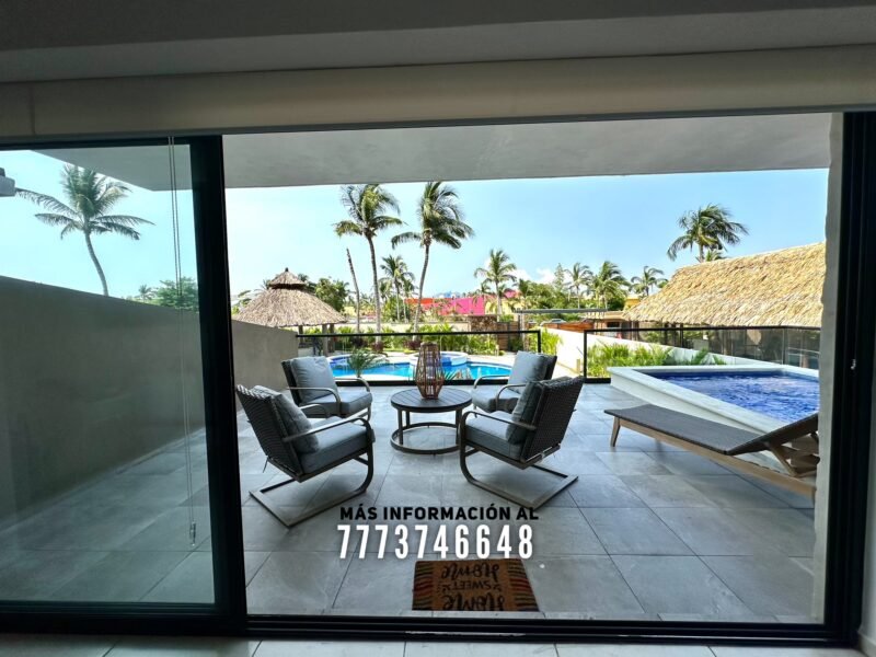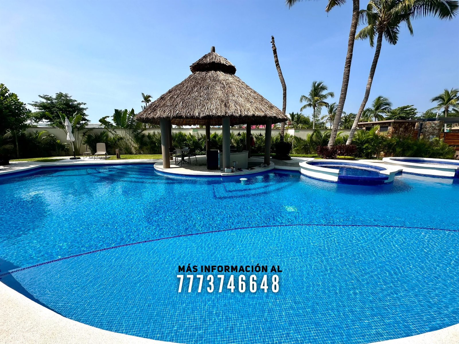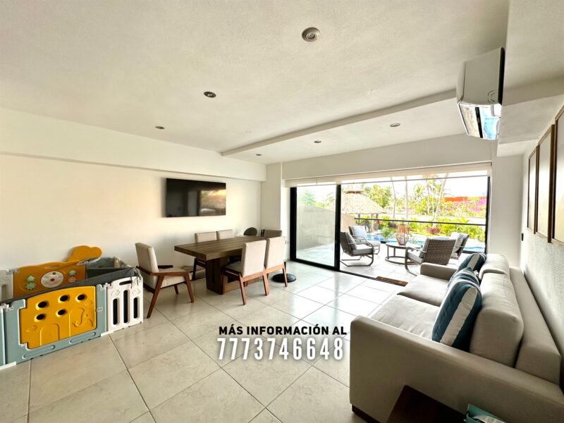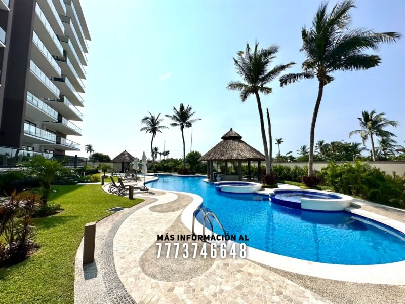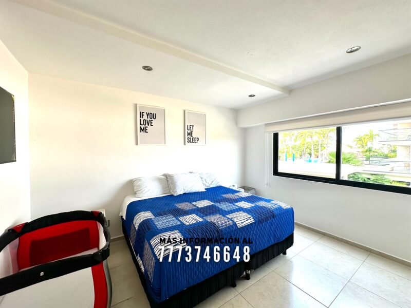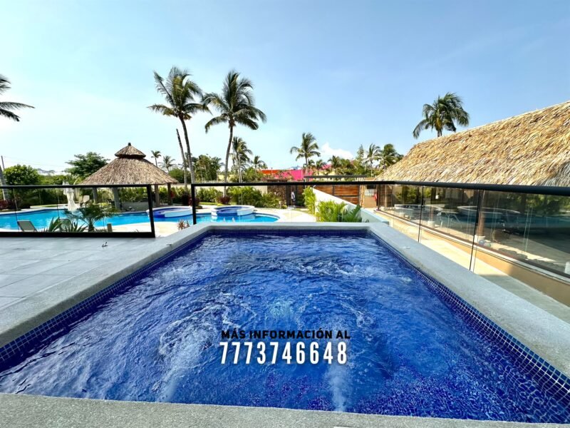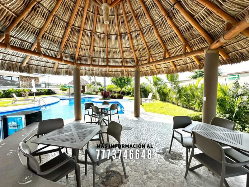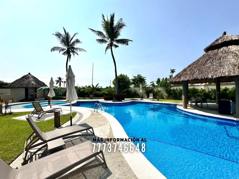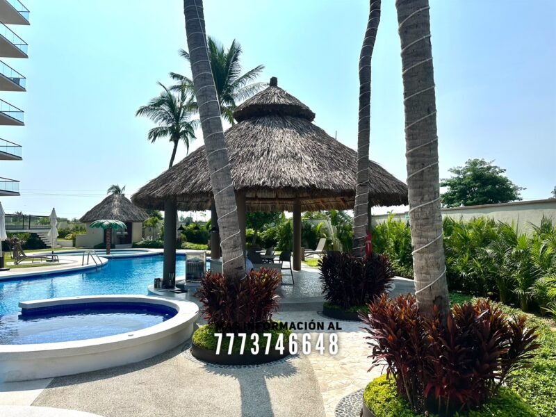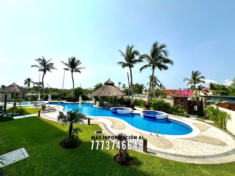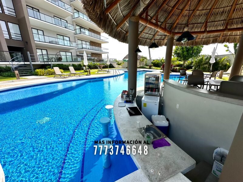 En áreas comunes tendrás grandes áreas verdes con hermosa decoración con plantas. Una asombrosa alberca, tiene excelente tamaño. Al igual que un par de jacuzzis, gran palapa con mesas y un aquabar. Este aquabar funciona 6 días de la semana, así que podrás disfrutar de tus días en la alberca mientras tomas tu bebida favorita. También cuenta con área infantil y un par de baños en exterior.