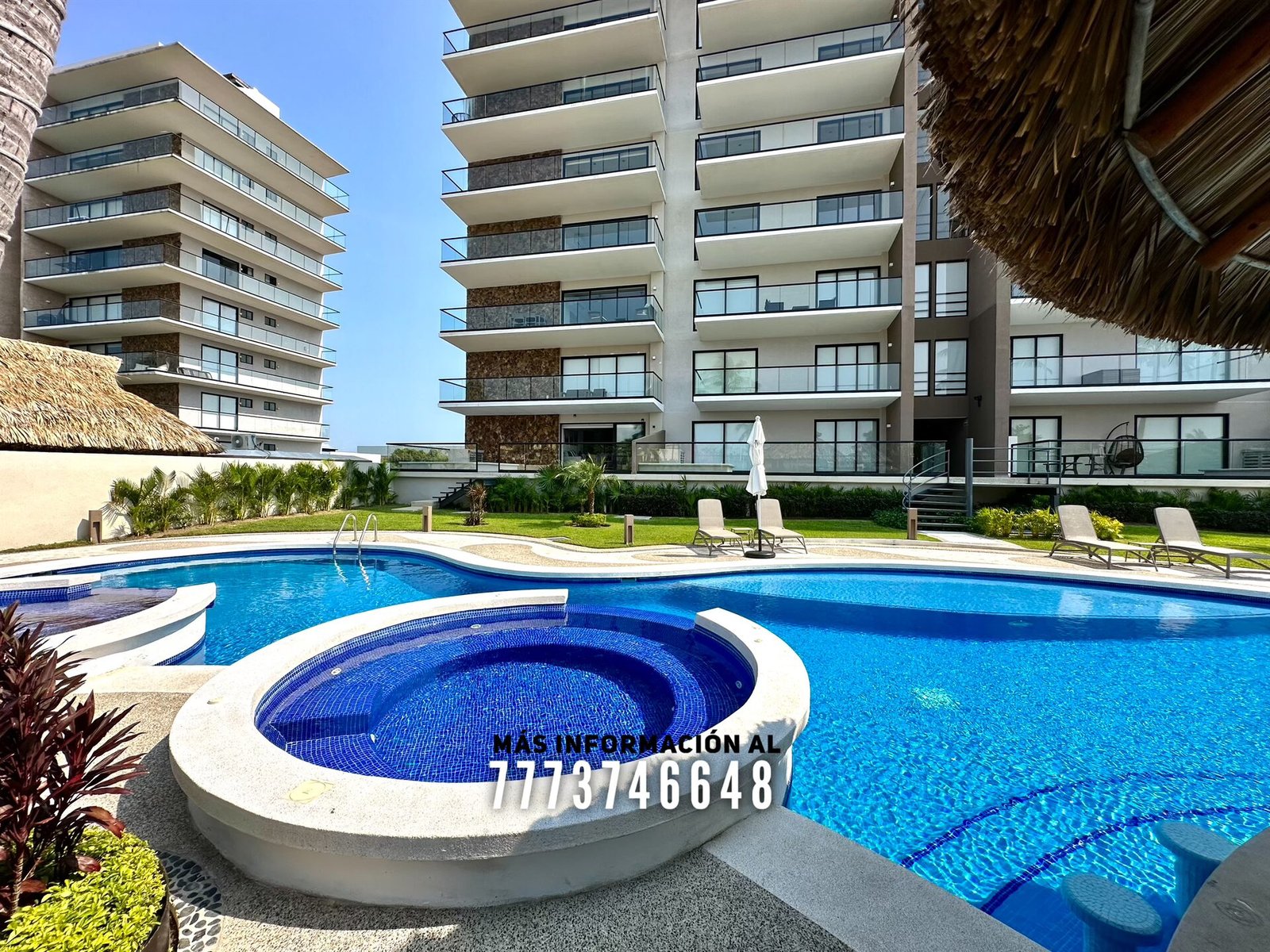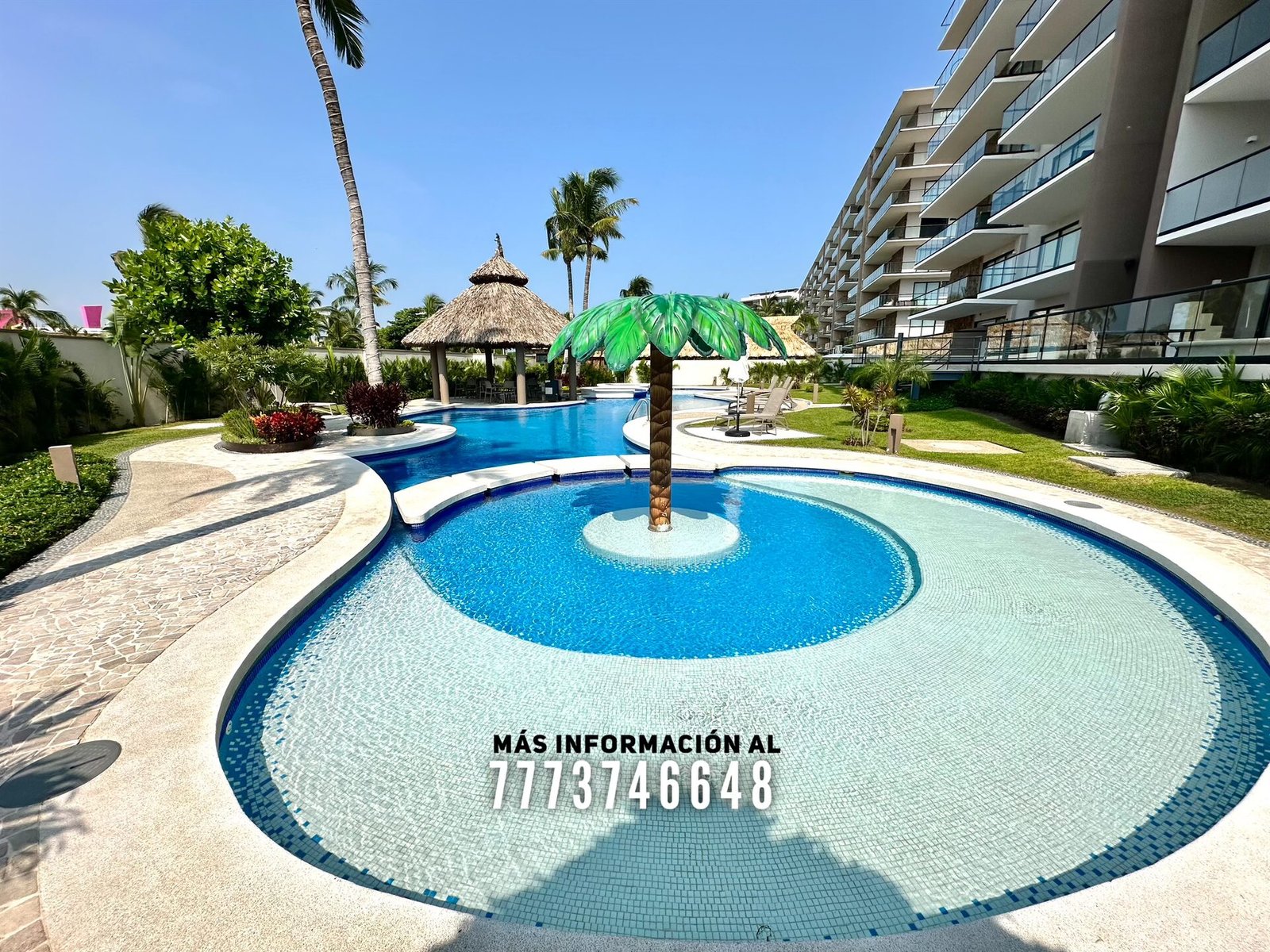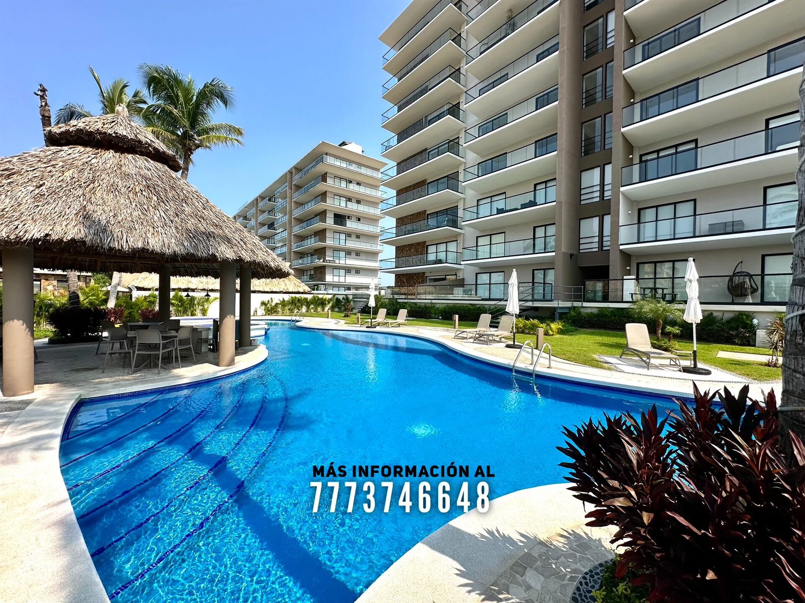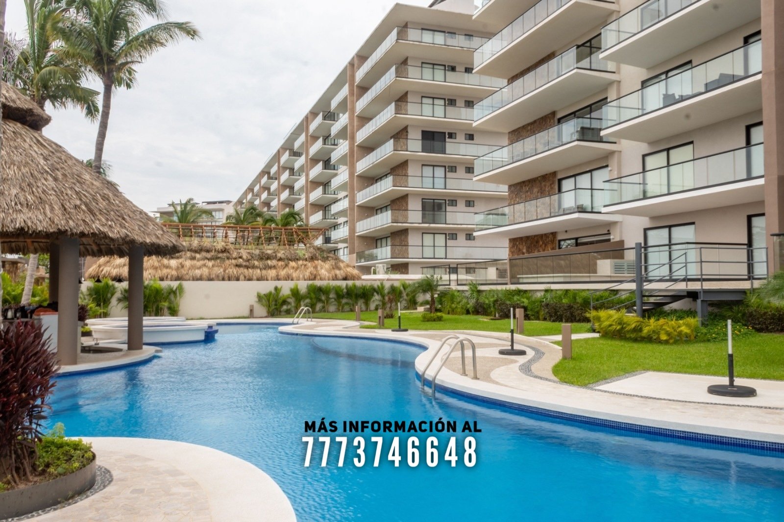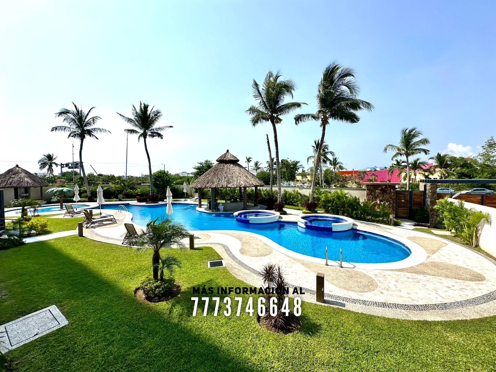 En áreas comunes tendrás grandes áreas verdes con hermosa decoración con plantas. Una asombrosa alberca, tiene excelente tamaño. Al igual que un par de jacuzzis, gran palapa con mesas y un aquabar. Este aquabar funciona 6 días de la semana, así que podrás disfrutar de tus días en la alberca mientras tomas tu bebida favorita. También cuenta con área infantil y un par de baños en exterior.